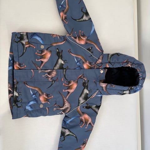 En lilla vinterjakke med hætte og knapper foran. Ærmerne har elastiske manchetter for bedre pasform. Der er en lille badge med brandnavn foran og en refleksdetalje bagpå for øget synlighed.