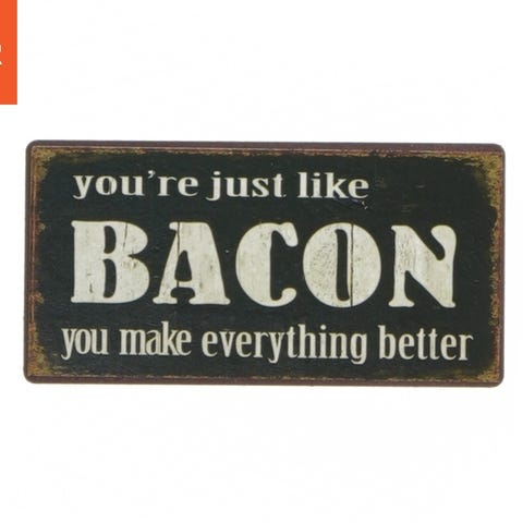 Dette dekorative skilt har en humoristisk tekst: 'You're just like BACON, you make everything better'. Baggrunden er sort med hvid tekst og har en let slidt udseende med brun kant. Det er et rektangulært skilt perfekt til køkkenet eller som gave til bacon-elskere.