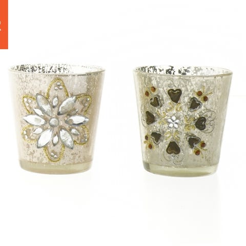 Dette er et sæt af to vintage stil lysestager lavet af metal og glas. De har en unik kroneformet ramme, og hver lysestage indeholder en glasbeholder med en lille hjertepynt, der hænger på en snor rundt om glasset. Designet er elegant og passer perfekt til indretning med et romantisk eller klassisk tema.