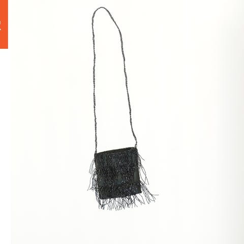 Lille taske med en størrelse på 21x23 cm, designet med nitter på forsiden og en kvastdetalje på lynlåsen. Tasken har en lang rem, der tillader den at bæres som en crossbody. Bagsiden af tasken er enkel uden udsmykning.