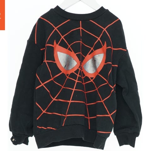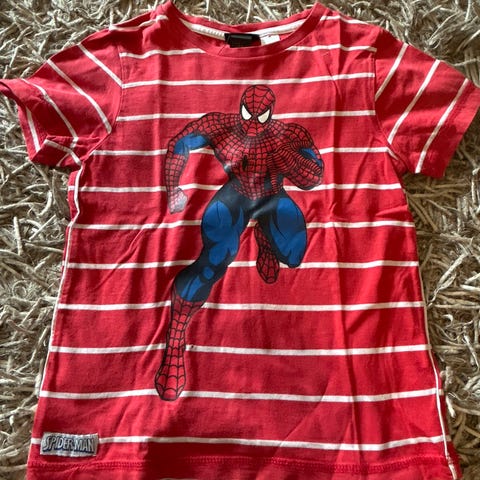 En langærmet t-shirt med tryk af Amazing Spider-Man på forsiden. Trøjen er olivengrøn og har rund hals. Brandet er Wheat og størrelsen er 152. Der er en lille mærkat ved kanten forneden.
