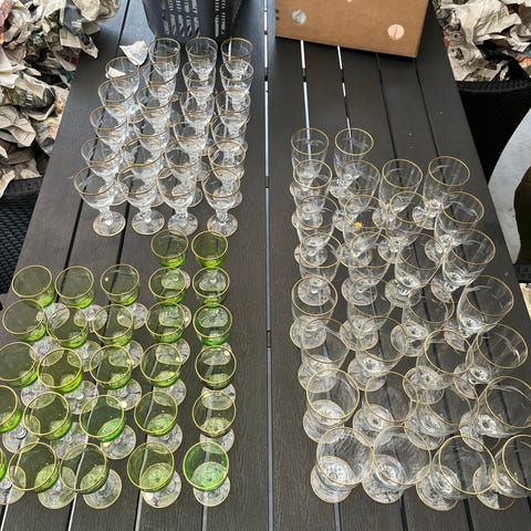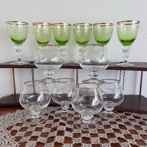 10 Snaps Glas 50 kr. pr. stk - 12 Portvin glas 50 kr. stk - 3 rødvin glas 150 kr. stk - 1 Cognac glas 75 kr. pr. stk- 7 Øl glas alle med Måger 150 pr. stk.