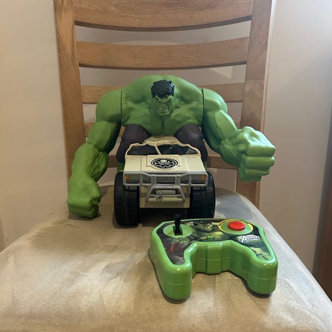 Dette er en fjernstyret bil med en Hulk-figur monteret på toppen. Figuren og bilen er primært lavet af plastmaterialer. Bilen har et simpelt design med hjul, der tillader bevægelse. Hulk-figuren er grøn og poserer dynamisk, som om han er ved at springe frem. Fjernbetjeningen, som følger med, har et Hulk-tema og er designet til at styre bilens bevægelse.