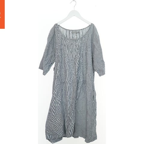 Kjole med ærmeløs design og et bymotiv trykt over det meste af stoffet. Nederdelen har et geometrisk mønster i sort, blå og hvid farver nederst.