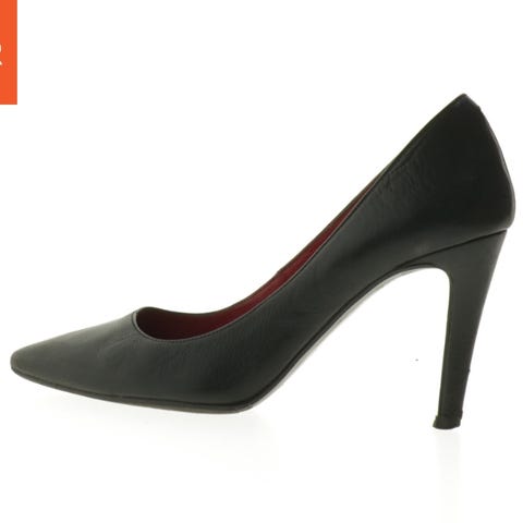 Et par grå stilletter lavet af glat materiale og med en spids tå. Hælene er høje og slanke. Størrelsen er 38. Det indre af skoen er brunligt, og der er en mærkning med tal og symboler i bunden af indersålen.