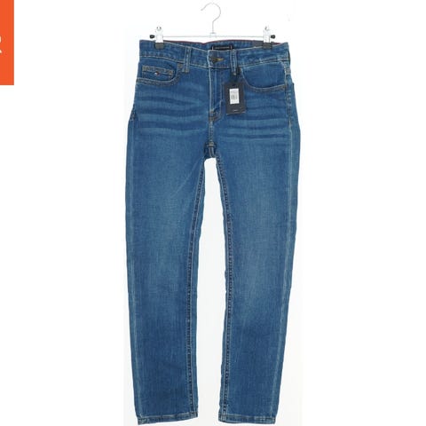 Et par blå jeans med klassisk design. De har sidelommer og baglommer samt en knaplukning foran. Bagpå er der et lille mærke med brandets navn.