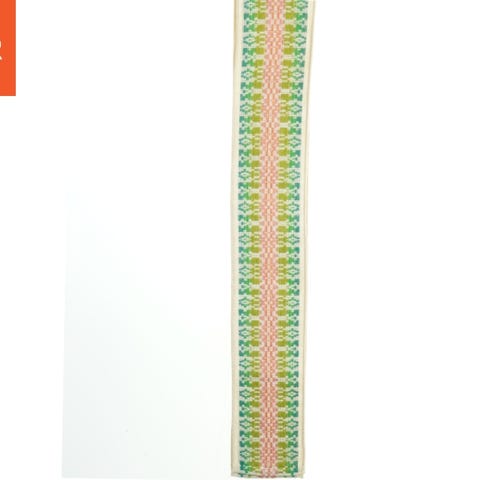 Denne genstand består af to stykker blondebånd, hver med en størrelse på 62x5 cm. Materialet har et mønster af små, kvadratiske åbninger, der giver et delikat udseende. Blondebåndet er ideelt til dekoration og kan bruges til forskellige håndarbejdsprojekter. Farven er lys creme.