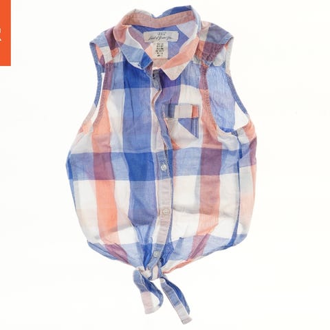 Ærmeløs skjorte med et sort-hvidt ternet mønster. Skjorten har en klassisk krave og en enkelt brystlomme med samme ternede mønster. Den er lukket med knapper foran.
