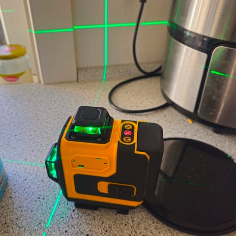 Dette er et gult laser niveau værktøj designet til præcis nivellering. Det har en stabil base med justerbare skruer og en integreret vaterpas. Enheden har to knapper på toppen for vandret og lodret betjening. Den måler 17,5 cm i højden.