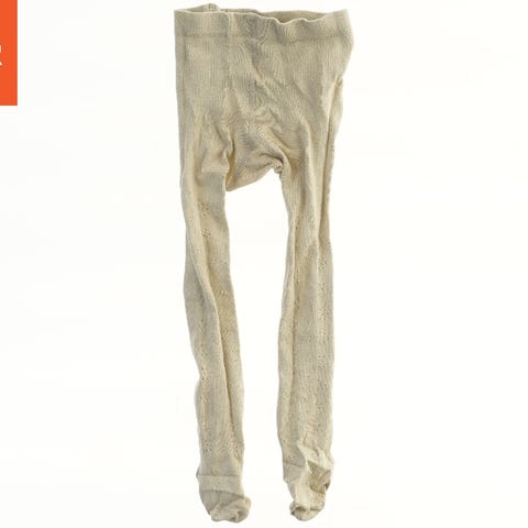 Beige strømpebukser lavet af et let materiale, der dækker benene og fødderne fuldstændigt.