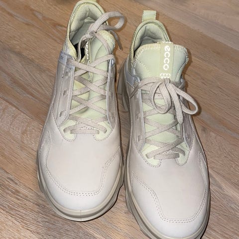 Ecco sneakers i størrelse 42 i skind med hvid, grå og blå farve. Skoene har en perforeret overflade og gummisål med mønster.