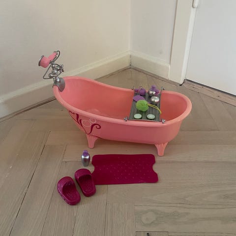 Forskellige sæt til luxus badekar og et sæt tøj. Badekar har batterier og laver lyd.
