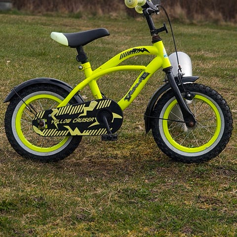 Børnecykel i grøn farve med 12 tommer hjul. Cyklen har støttehjul og er designet til børn. Materiale og mærke er ikke oplyst.