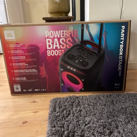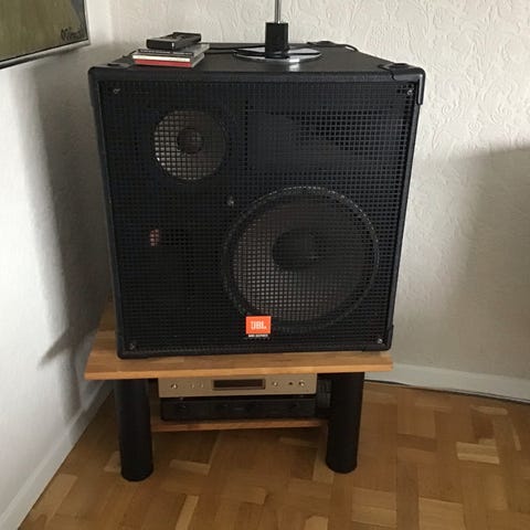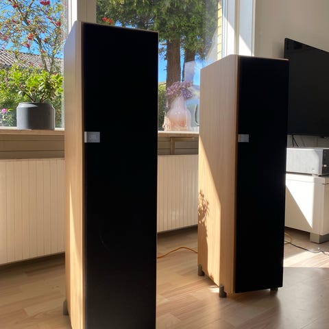 JBL højtaler med stativ, fremstillet i Danmark. Højtaleren har en sort front og træfinish på siderne. Den har en systemimpedans på 4 ohm og er designet til at levere lyd i høj kvalitet.
