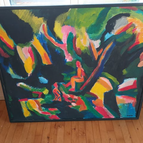 Herman Kallbach maleri, motiv af en mor der holder et sovende barn. Maleriet er indrammet i en dekorativ ramme. Bagpå er der en label med kunstnerens navn og copyright information. Velegnet til vægophæng i hjem eller galleri.
