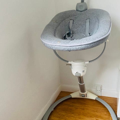 4moms børnelænestol i lys farve med polstret sæde og sikkerhedssele. Designet til børn og udstyret med bøjle til ophængning af legetøj. Egnet til brug som hvilestol eller til afslapning.