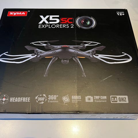 UBRUGT Syma X15 drone med fjernbetjening i hvid farve. Inkluderer propellerbeskyttere, ekstra propeller, skruetrækker og brugervejledning. Egnet til brug fra 8 år og opefter.
