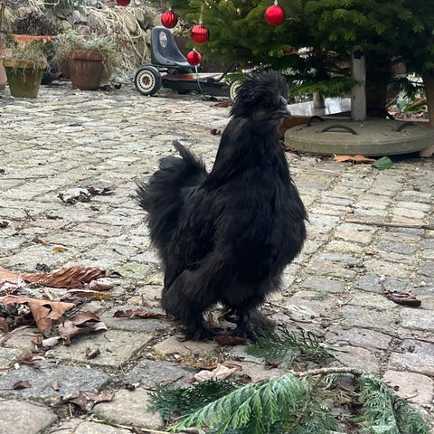 Silkehanen, Candyfloss, søger nye græsgange, da vi har for mange haner. Han er en flot hvid US silkie fra i sommers. Mild og vant til at blive håndfodret og håndteret af børn.