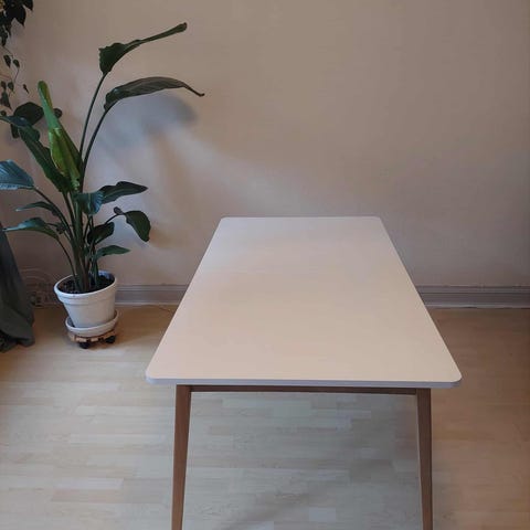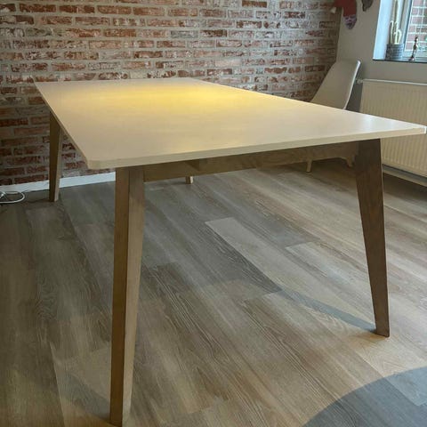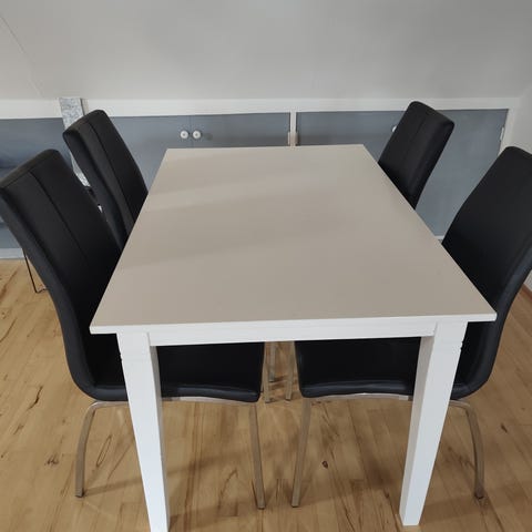 Fin hvid bord . Med egetræ ben og ramme under. 1 tillægsplade medfølger, på 45 cm så bordet kan blive 245 cm. Har et afslag i kanten som kan ses på det ene billede. 6 stk stole kan medfølge gratis der dog er ret slidte, hvis jeg ikke når at få kørt dem på lossepladsen inden. Stolene er hvide skal stole med egetræs ben. Befinder sig I 8300 odder