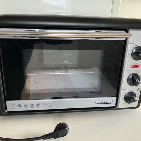 Steba ECO Miniovn med funktioner, såsom drejespyd, varmluft, over- og undervarme. Ovnen har temperaturindstilling op til 230 grader, tre drejeknapper til temperatur, programvalg og timer.