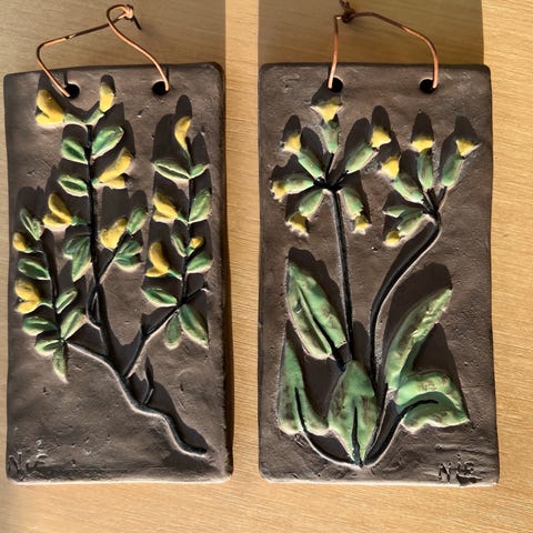 Alve Nordenhielm dekorationsornamenter monteret i en træramme med rød baggrund. Ornamenterne er metalliske og har en uregelmæssig form. Rammen har udskårne detaljer og en ophængningswire på bagsiden.