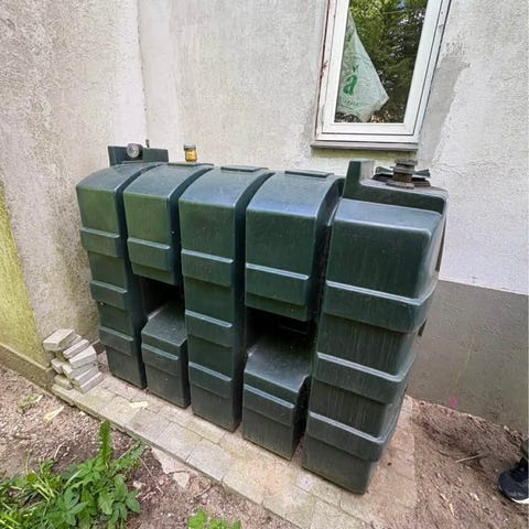 Oliebeholder med tilhørende brænder, anvendt til opbevaring og forbrænding af olie. Beholderen er rektangulær med afrundede ender og fremstår i metal med synlig brugsslitage. Brænderen er monteret og har et blåt dæksel. Produktet er egnet til installation i hjemmet.