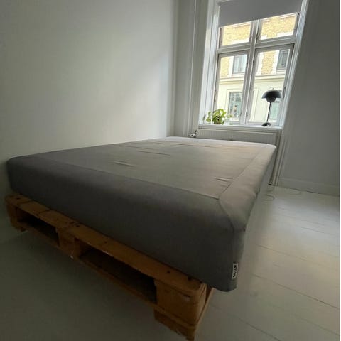 Vi har købt ny seng, og skal derfor af med vores gamle. Den har ret høje ben, som gør at man kan have bedrollers under - meget praktisk!