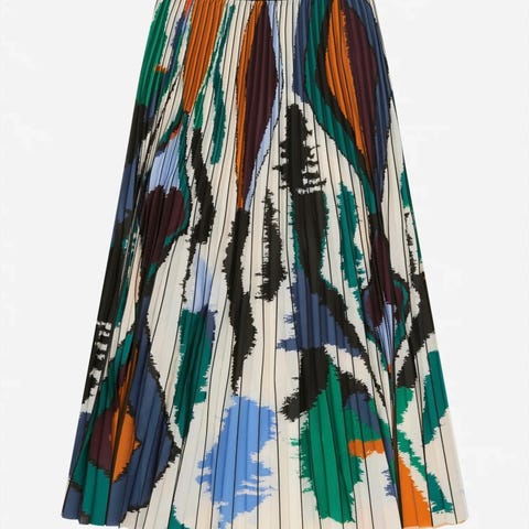 Munthe nederdel med foer. Sandfarvet med sort og guld mønster. Lommer i siderne. Flæse foran og forneden.