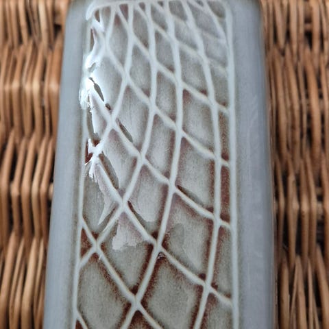 Formen er stram og tidstypisk med lodrette rifler i godset og en smuk kontrast mellem den mørke yderside og den lyse, glaserede inderside. Et klassisk eksempel på dansk mid-century modern keramik.