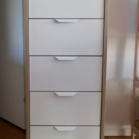 I toppen er der fire små skuffer var nede ad dig 2 × 3 skuffer. Så rigtig mange skuffer hvor man kan ligge den ned. Tingene ovenpå kommoden følger ikke med.