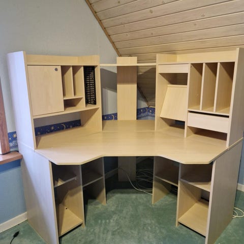 Fin lille skrivebordspult i lyst træ. Enkel og klassisk i udtrykket med lille hylde og skuffer til opbevaring. Perfekt til børneværelse lektier kreativt hjørne eller som kompakt hjemmearbejdsplads.