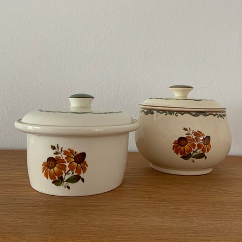 Den anden (SOLGT) er et cigaretbæger, som er "lavet om til" sennepskrukke - med et låg (som jeg ikke ved, hvor hører til) og en fin benske. SOLGT.