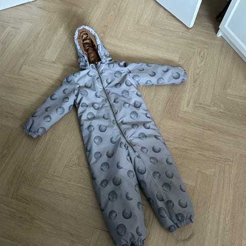Lynlås, for og stropper er intakt. De eneste brugsspor er let slid på knæene og ved ærme- og benudgang. Men det er ikke meget. Ellers er den fin. Farven er en lilla/mørk rose med blomster. Med lysebrunt for.