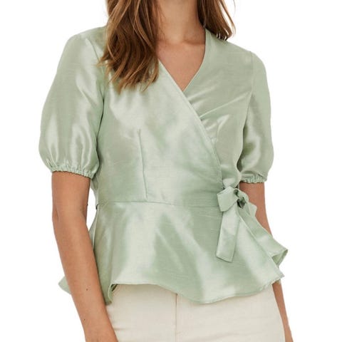 #veroModa #slåom #wrapbluse #lysegrøn #mintgrøn #shine #bluse #kortærmet #sløjfe #bindebånd #taljebånd #vhals #pufærmer #only #cos #mango #zara #jdy #yas