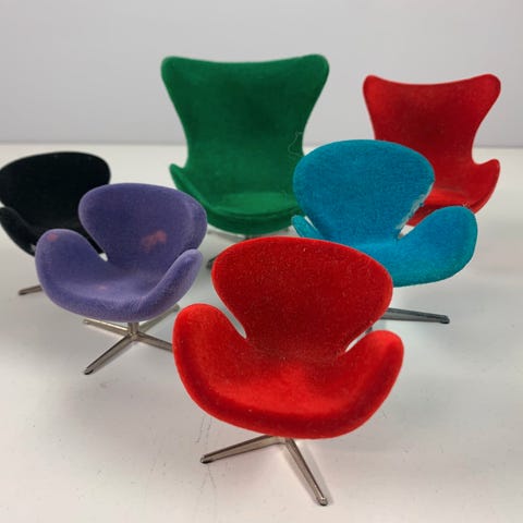 Håndlavede miniature rokoko møbler af sølv, stemplet med lødighed 800/1000. Bestående af rundt bord på trepas ben, fire stole hvoraf en med armlæn. Dekoreret med putti, personer og cocaille. H: 6,0 cm. Vægt i alt 69 gram. Fem dele i alt.