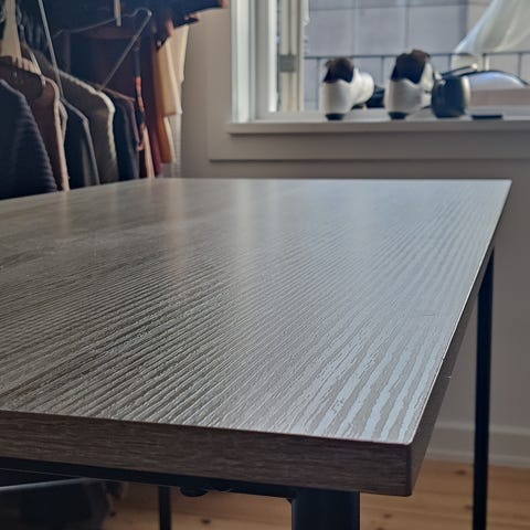 Med fem forskellige skuffer og ben, der kan justeres i højden. Stolen kan dreje og justeres i højden også. Brugspor (se billeder), men ellers helt funktionelt.