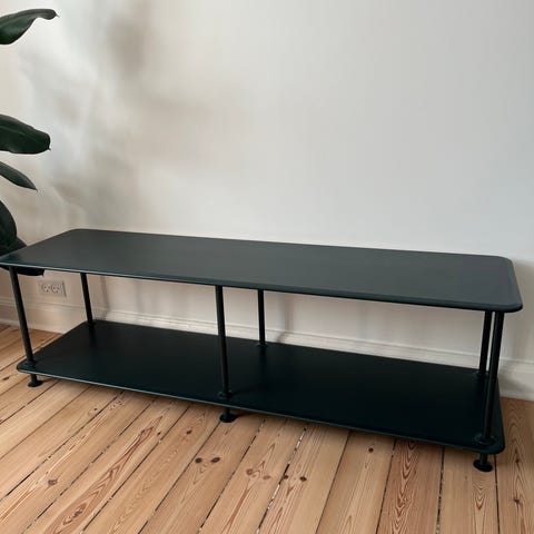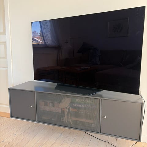 Den er specialdesignet og specialbestilt hos Montana til at rumme forskelligt elektronik til et TV, herunder også plads til 2 højttalere, hvis man ønsker det (se rummene i siderne). Vi har boret et hul i toppen, så kabler kan føres ud ét sted, men med minimal påvirkning af det æstetiske udtryk. Den er generelt i god stand, men kan have behov for lidt opfriskning af malingen (vi har vedlagt et billede, hvor malingen er let afskallet). Overordnet set er den klar til at blive installeret i dit hjem og nydt!