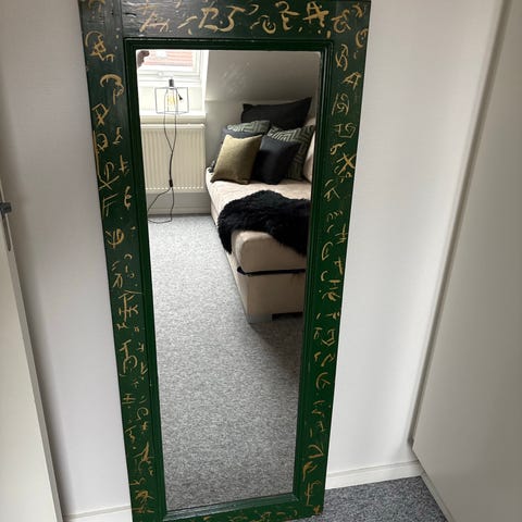 Spejl med sort og rød ramme og skuffebord