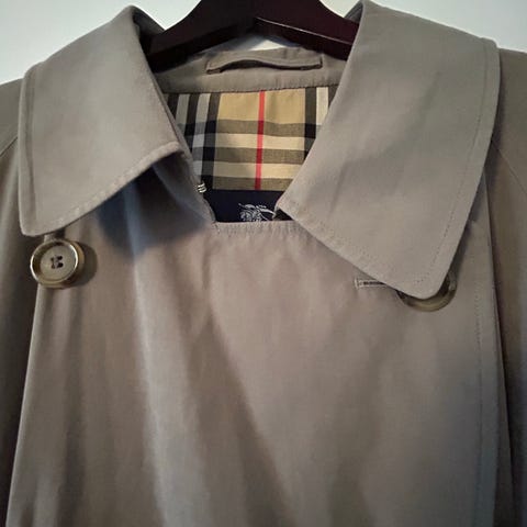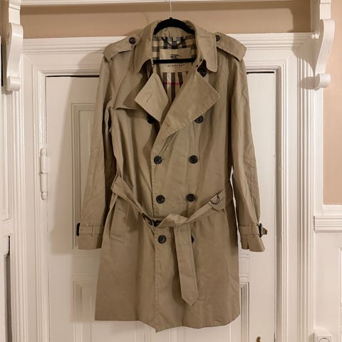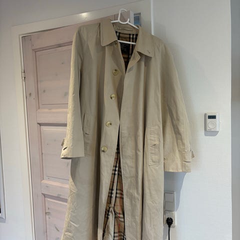 Burberry Frakke, lavet af bomuld i beige farve. Frakken har en klassisk trenchcoat-stil med dobbeltradede knapper og bælte i taljen.
