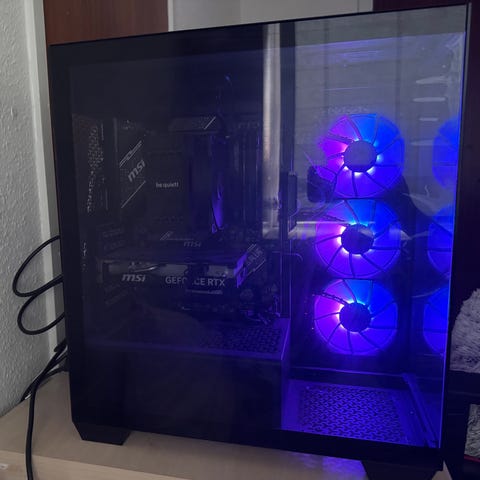 MSI gaming stationær computer med hvidt kabinet og gennemsigtigt sidepanel. Udstyret med interne køleblæsere, MSI Radeon grafikkort og Kingston Fury RAM-moduler. Velegnet til gaming og generelle computeropgaver.