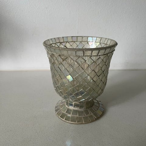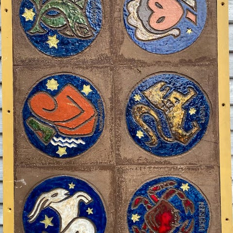 Keramisk mosaiktallerken med et snegl motiv i midten. Tallerkenen har en flad form med en diameter på cirka 30 cm. Mosaikstenene er i hvide, sorte og gule nuancer, og motivet er placeret centralt. Tallerkenen kan bruges som dekorativ genstand.