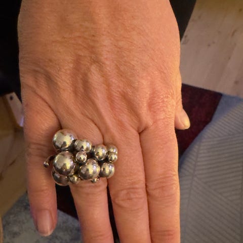 Elegant og tidløs ring designet af Vivienne Torun Bülow-Hübe, en af det 20. århundredes mest anerkendte smykkedesignere. Ringen er udført i sterling sølv (925) og kendetegnet ved Toruns karakteristiske, organiske formsprog og den bevægelige, polerede kugle – et design med både ro og styrke.