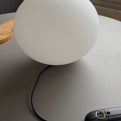 Flos Jasper Morrison bordlampe med hvid opalglas. Designet af Jasper Morrison. Lampen har en rund form og er velegnet til brug som dekorativ belysning i forskellige rum.