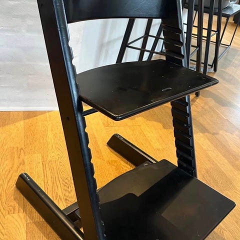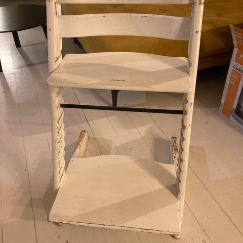 Stokke Tripp Trapp højstol i hvid træ. Justerbar sidde- og fodplade for tilpasning til barnets vækst. Designet til børn og kan bruges fra babyalder til voksen. Robust konstruktion med fokus på ergonomi og komfort.