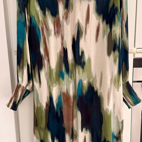 Elegant klänning / skjortekjole med lange ærmer og et stilfuldt prikket mønster. Kjolen har en klassisk krave og en knaplukning hele vejen ned foran. Den har også et bindebånd i taljen, der fremhæver figuren.