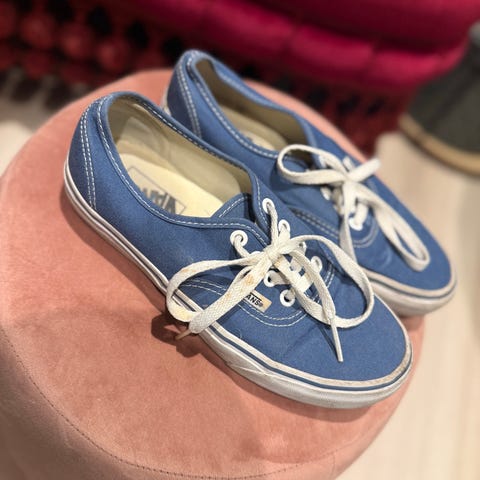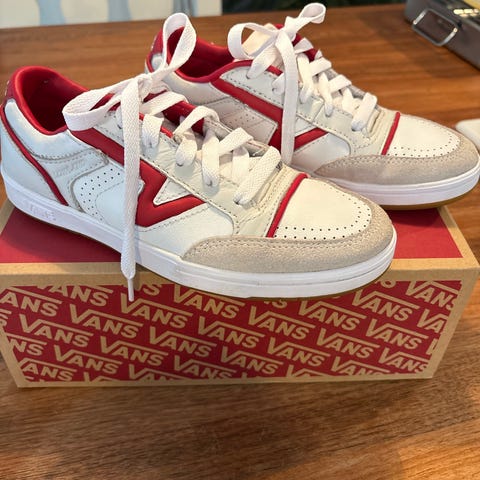 Vans sneakers i størrelse 38 med rød farve. Skoene har hvid snøring og klassisk gummisål med mønster. Materialet er tekstil og gummi. Velegnet til casual brug.