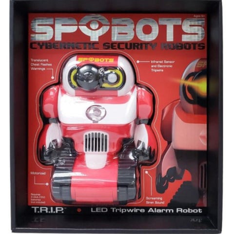 SpyBots TR-1 Robot i farven rød. Denne robot er designet til sikkerhedsformål og er udstyret med infrarøde sensorer og bevægelige arme. Ideel til leg og læring om robotteknologi.