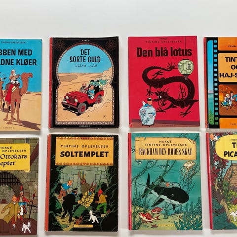 6 TINTIN bøger med forskelligt slid. De ældste er mest slidte. De 2 nyeste er meget fine.