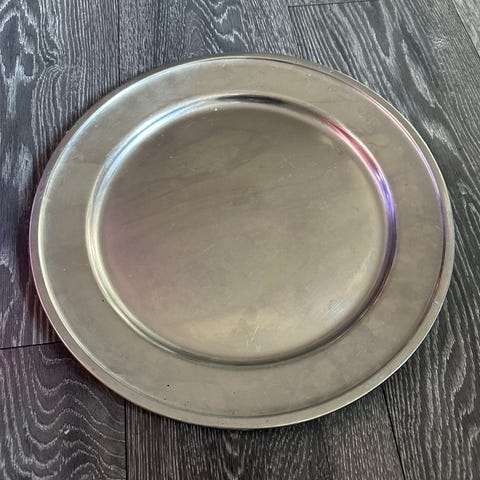 Serveringsfade i rustfrit stål med håndtag i træ. En enkelt med låg. Den største måler 25 cm i diam.