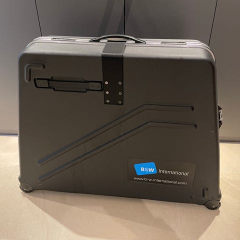 Praktisk og sikker cykkelkuffert. Brugt, men velfungerende. Bemærk, at der kun er en enkelt og to nøgler. For at kompensere for den manglende lås anvender jeg en bagagestrop, som naturligvis medfølger. Derudover er der to låsemekanismer i hver side (se foto). Bunden har været revnet, men er repareret (se foto). En af de indvendige stropper er gået løs. Se foto for indvendige mål. Der medfølger opbevaringspose og beskyttelse til forgaffel/ramme.